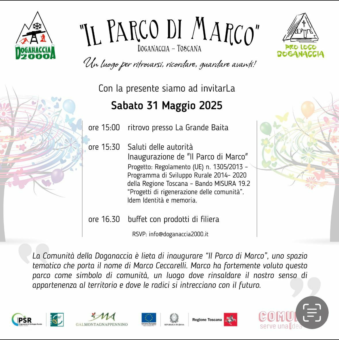 La comunità della Doganaccia vi invita, sabato 31 maggio 2025, all’inaugurazione del Parco di Marco, uno spazio tematico che porta il nome di Marco Ceccarelli, che l’ha fortemente voluto come simbolo di comunità e di appartenenza, luogo dove le radici si intrecciano con il futuro.